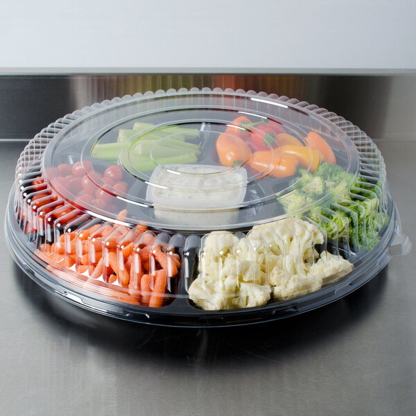 Your appetizers, desserts, miniatures and hors d’oeuvres deserve to get noticed yet needs to be clean and protected. The solution isFineline Platter Pleasers 9801-LL 18″ Clear PET Plastic Round Low Dome Lid! These leak proof, tight fitting lids prevents spills during product transport. At the same time, it keeps your edibles sanitized while its’ clarity optimizes product visibility. Great to be used in restaurant, café or deli as well.